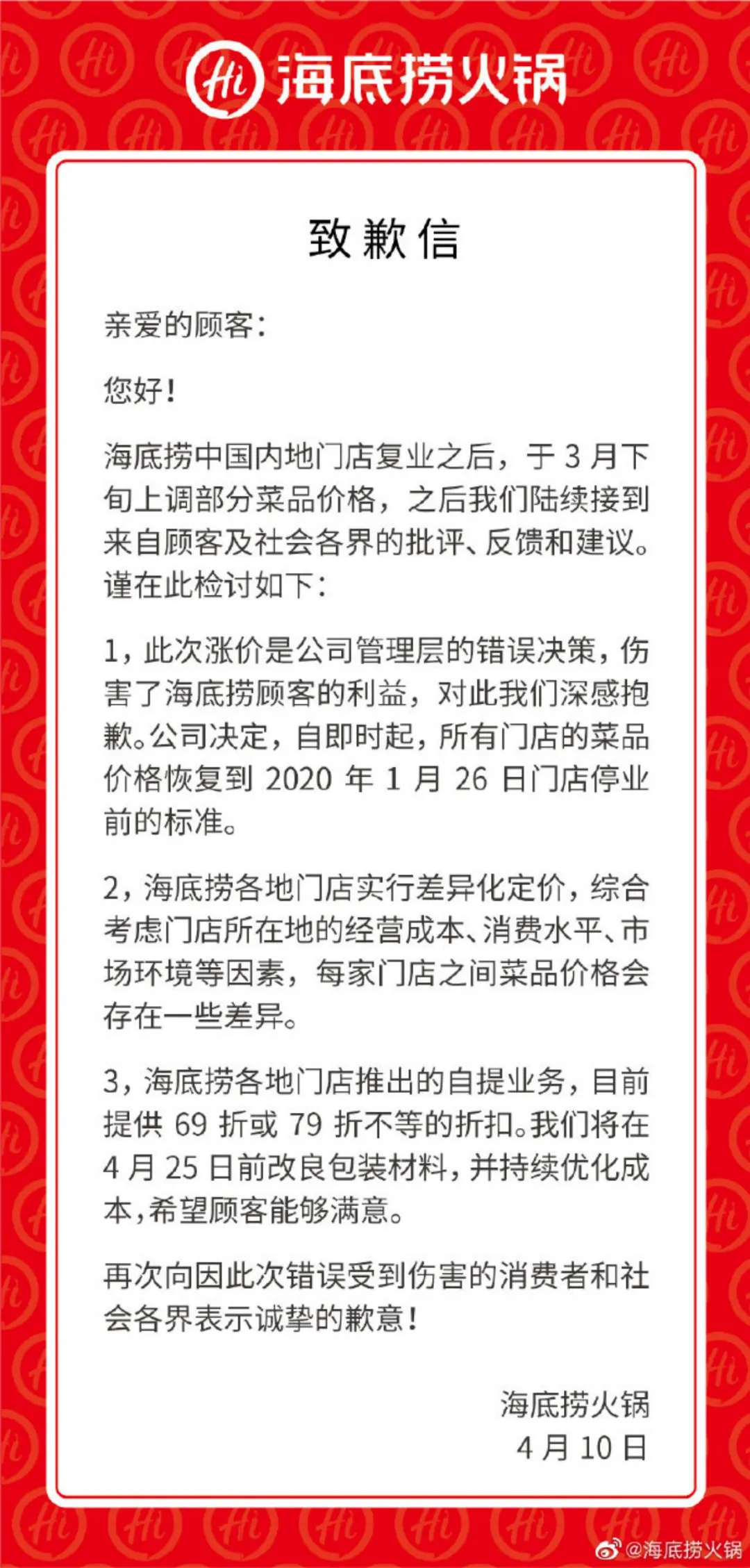 去年疫情复工后,海底捞门店被消费者质疑菜品涨价。2020年4月10日,海底捞发布致歉信表示“此次涨价是公司管理层的错误决策,即日起门店菜品价格将恢复至疫情前的标准。”涨价背后,是海底捞在尽力压缩成本的事实。