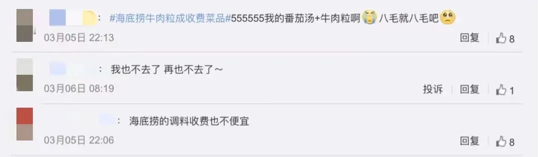 今年3月,消费者们发现海底捞的“牛肉粒变素了”。海底捞客服对媒体表示,“确实已在上海部分门店试点将牛肉粒替换成一种大豆素肉制品,主要是因为之前很多顾客将牛肉粒小料当作菜品无限制使用,造成了浪费”。而后,对于节省成本的论调,海底捞官方给出了回应,称“味伴侣作为一种植物蛋白产品,使用了创新技术制作而成,成本比牛肉粒要高”。在宣布该消息的同时,海底捞透露3月5日起,在上海的31家试点门店将开始把牛肉粒列入菜品菜单,即约50g/份,售价为0.8元。就此,海底捞免费的“番茄汤+牛肉粒”灵魂CP宣告下架。