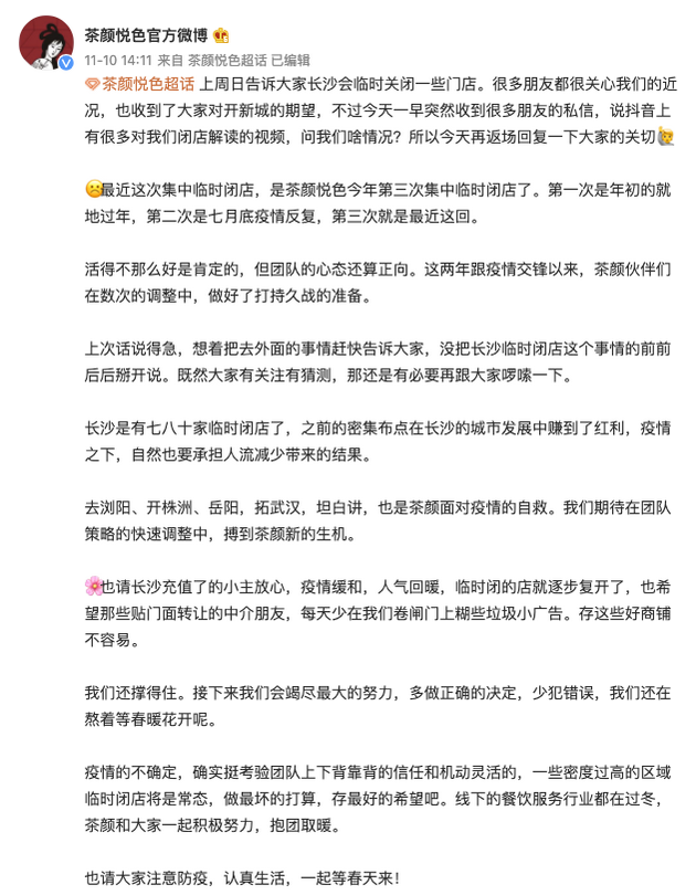 11月7日,茶颜悦色曾发微博解释:“最近在长沙密集布点的区域有些门店临时闭店了。主要原因还是疫情反复下,高密度布点大家都吃不饱了。”并解释了具体原因:“这两年疫情经常有反复,防疫也呈现常态化,这个状况下看我们长沙的高密度布点,双刃剑效应的副作用愈发显现。”