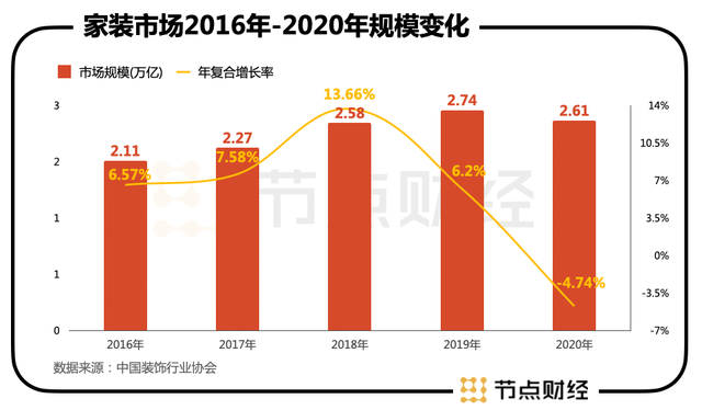 据中国装饰行业协会数据显示,2015年至2019年,我国家装行业的市场规模持续增长,年复合增长率CAGR达到8.46%,2019年市场规模达到2.74万亿元。由于受疫情影响,2020年家装市场规模首次下滑,其市场规模为2.61万亿元,同比下降4.74%。而据前瞻研究院预计,随着居民消费热情的提高,2021年家装行业市场将迎来补偿性反弹。