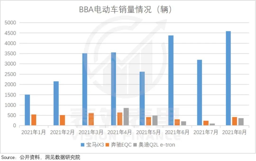 如下图,今年以来BBA 的电动车销量,都有些不尽人意。其中,宝马iX3销量相对更好,是大幅度降价的结果。