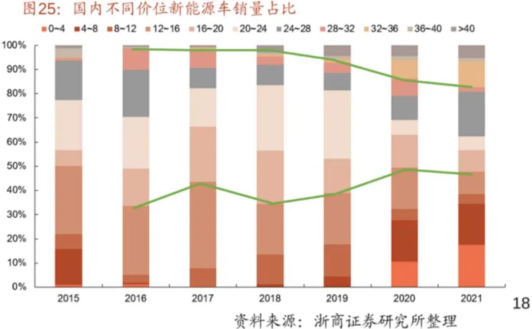 目前来看,该价格区间,已经被大部分新能源车企覆盖或计划覆盖,同时该区间的销量占比近几年是收窄的。新进入者,或将面临销量和毛利上的压力。
