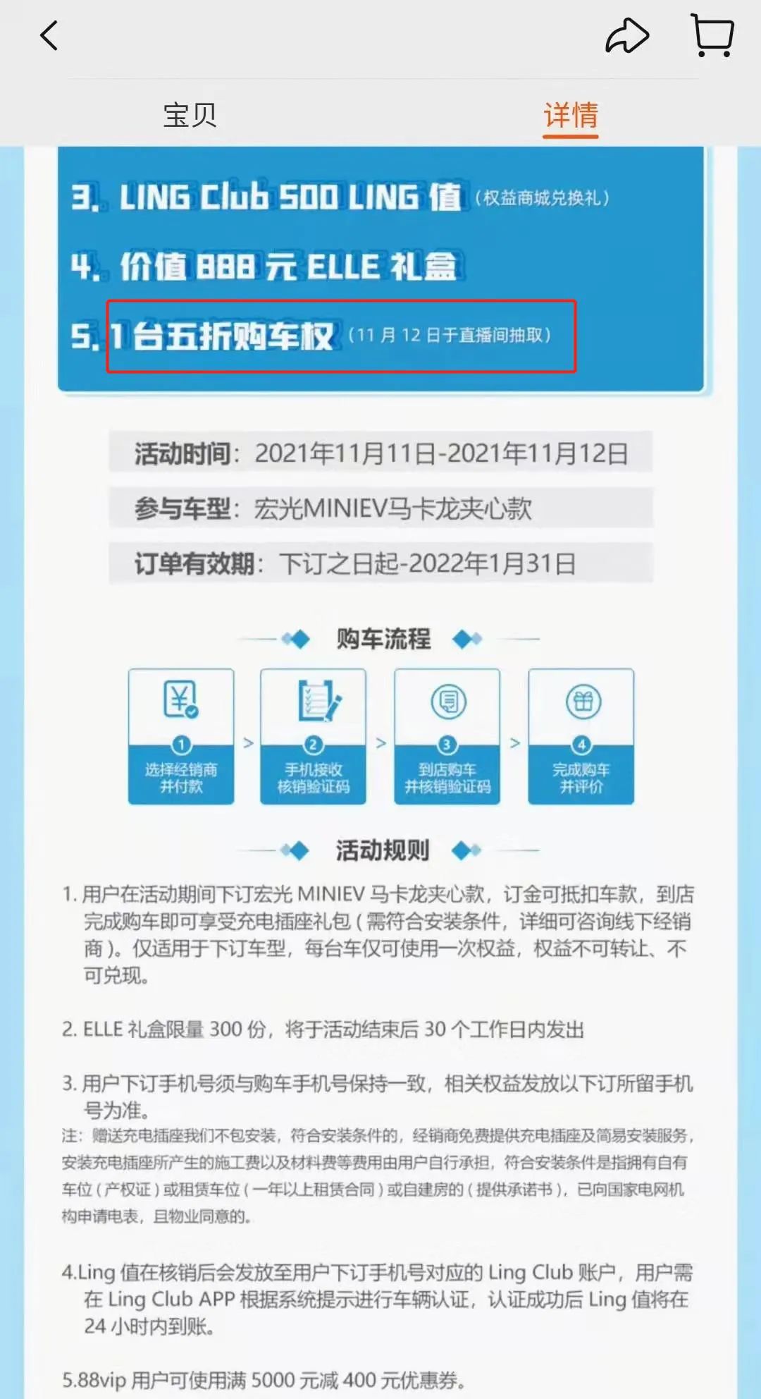宏光MINI EV半价车抽奖规则,截图自淘宝APP