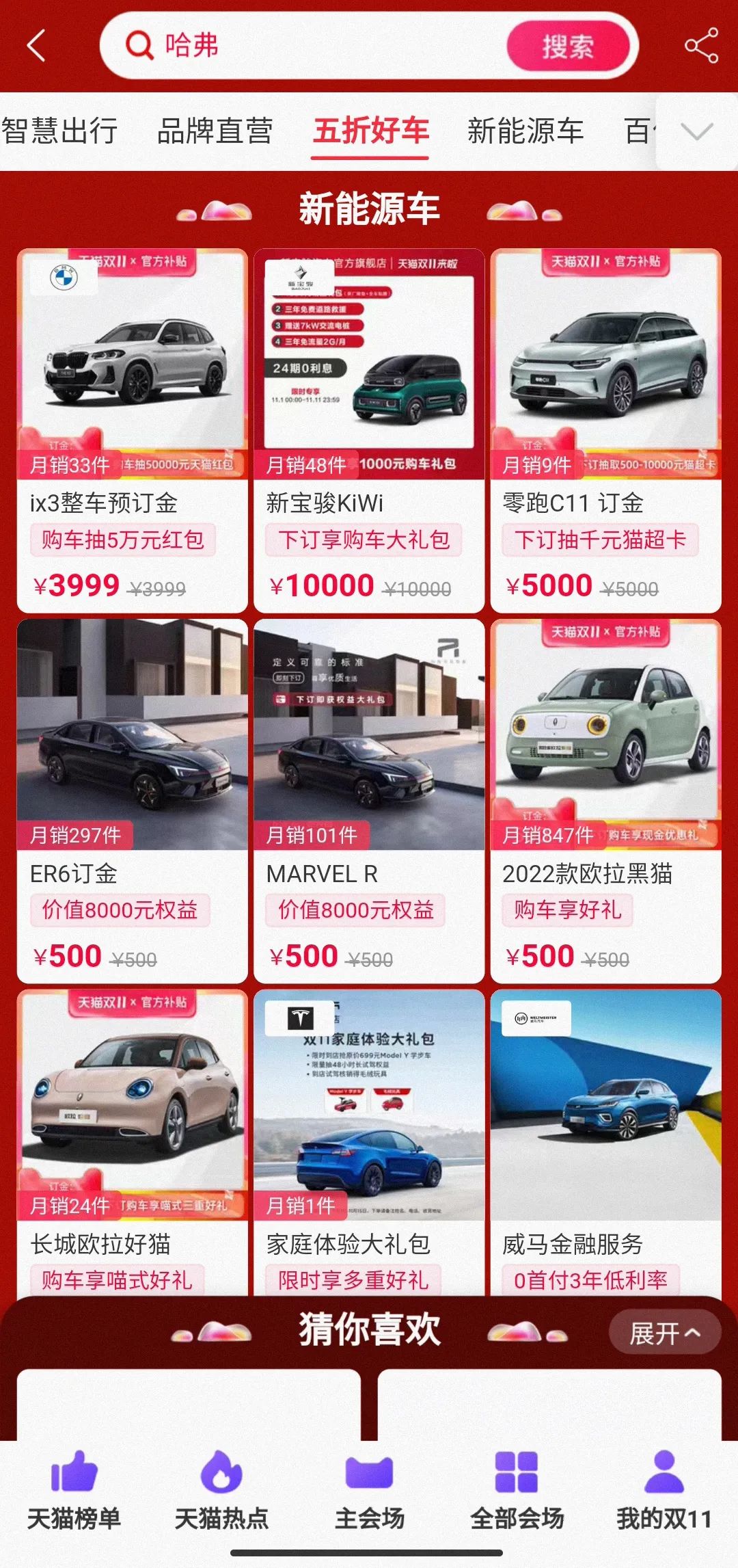 连线出行在11月11日当天来到天猫汽车“双十一”活动页面,确实可以看到页面陈列着诸多品牌的车型。作为率先开启线上下单、线下提车、全国统一价销售模式的新能源车企们,自然成为活动中的主角。