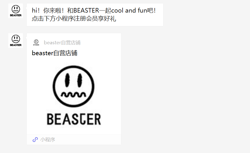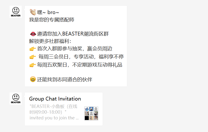Beaster的微信闭环从关注Beaster的微信公众平台开始作用:关注的欢迎语会指引添加工作人员微信,工作人员作为“专属搭配师”会引导粉丝通过小程序的自营店铺注册会员,加入微信粉丝群来进行进一步的引导和转化。