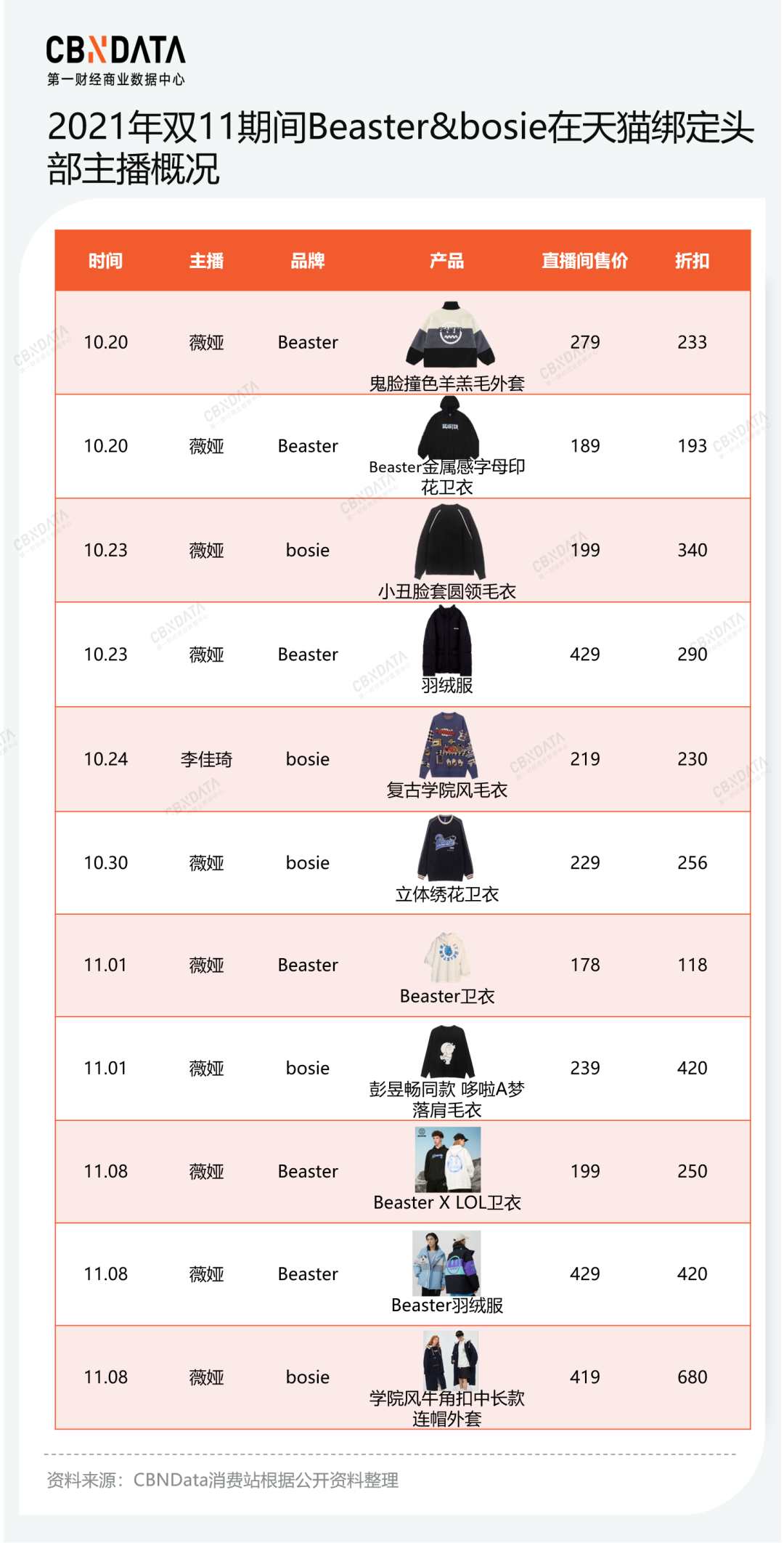 Beaster今年继续绑定了在服装时尚领域带货强势的薇娅。预售第一天,Beaster就有两款产品登上了薇娅直播间,截至10月21日,Beaster紧随老牌男装波司登和PEACEBIRD同登销量榜前三名。在天猫双11期间,Beaster一共有7款产品与薇娅展开了合作,其中也包括了与英雄联名合作的新款卫衣。bosie除了薇娅也与李佳琦展开了合作,bosie从10月23日起共登头部主播直播间5次,其中薇娅直播间4次,李佳琦直播间1次,此外,bosie也把“彭昱畅”同款的哆啦A梦毛衣带进了直播间。
