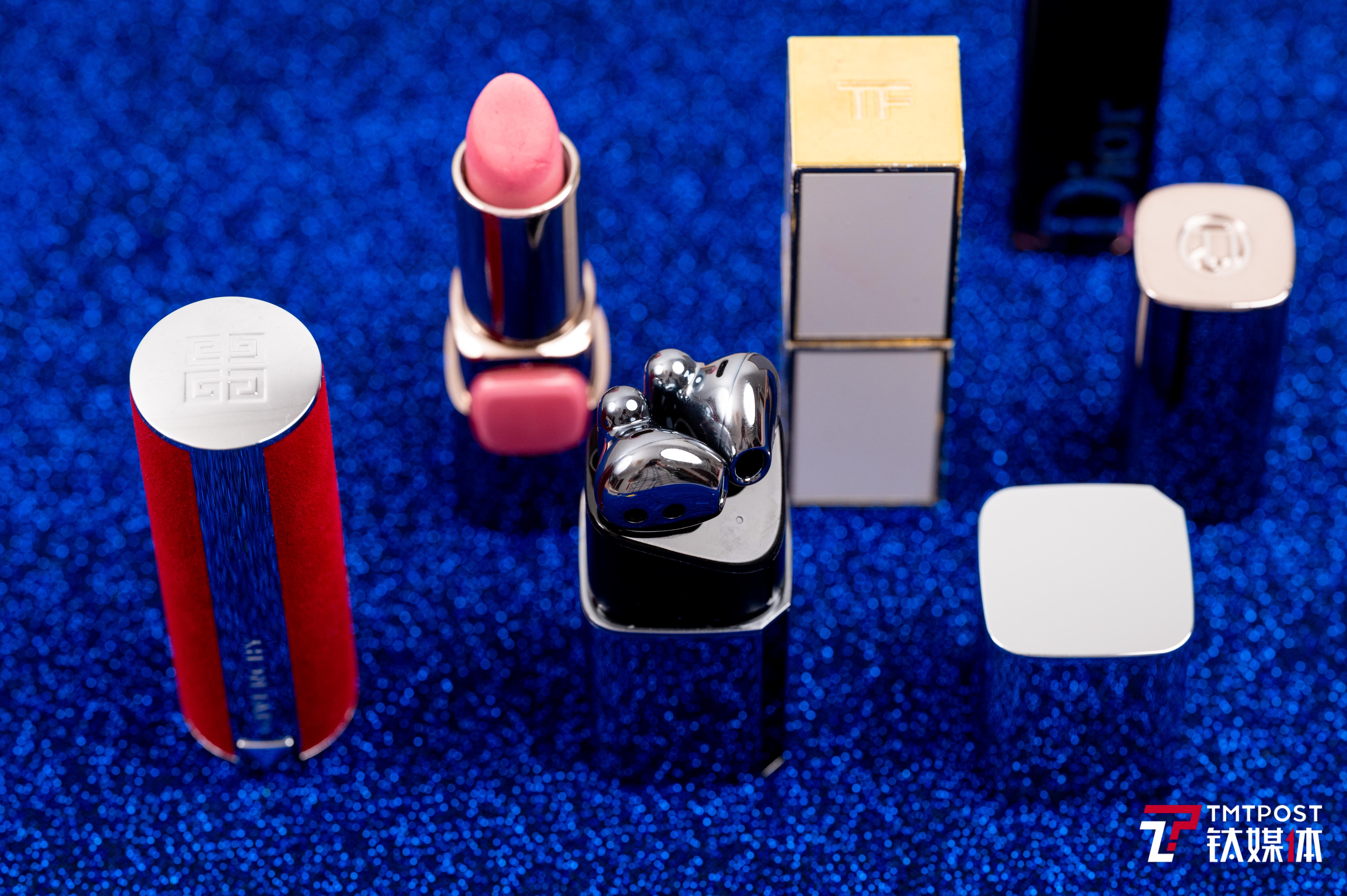 华为“口红耳机”在设计理念上更多的采用了“完全拟物”的设计思路,把它放在一众口红堆里,它真就像一只“口红”。