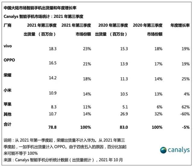 “荣耀第三季度在国内大量渠道恢复铺货,加上一部分华为用户换机需求,在主力机型荣耀50系列,以及畅玩20和X20的推动下,环比增长达到105%。”Canalys分析师Toby Zhu在第三季度出货报告中表示。