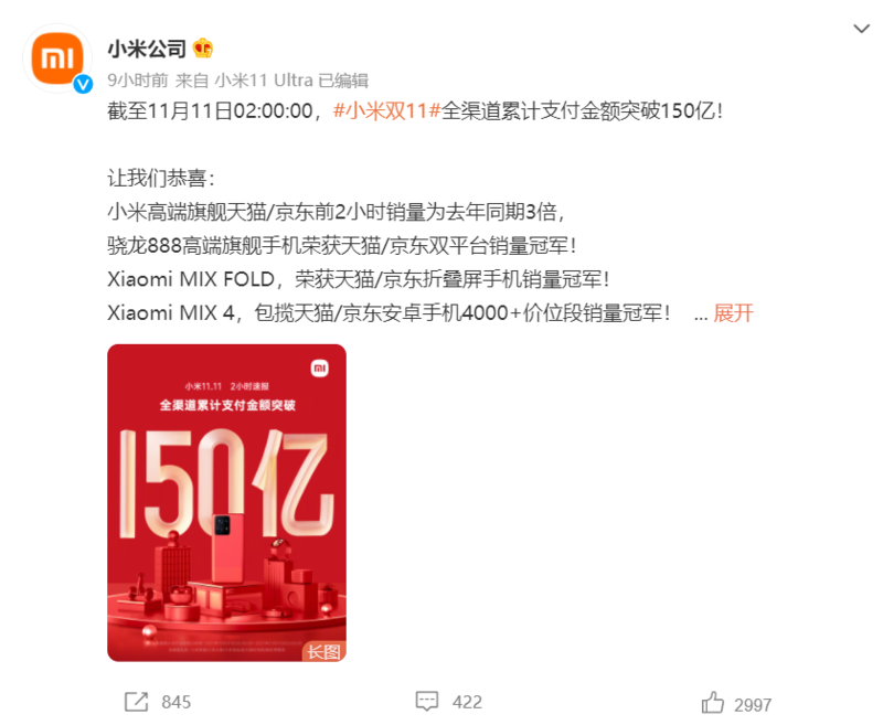 据小米官方宣布,截止11月11日凌晨两点,小米全渠道支付金额突破了150亿元,超过去年同期(11月11日凌晨3:25)的100亿元,获得天猫/京东/苏宁易购安卓手机销量冠军。其中小米MIX4斩获天猫/京东4000元价位安卓冠军,小米 MIX FOLD 获天猫/京东折叠屏手机销量冠军,骁龙 888系列手机获天猫/京东双平台销量冠军。