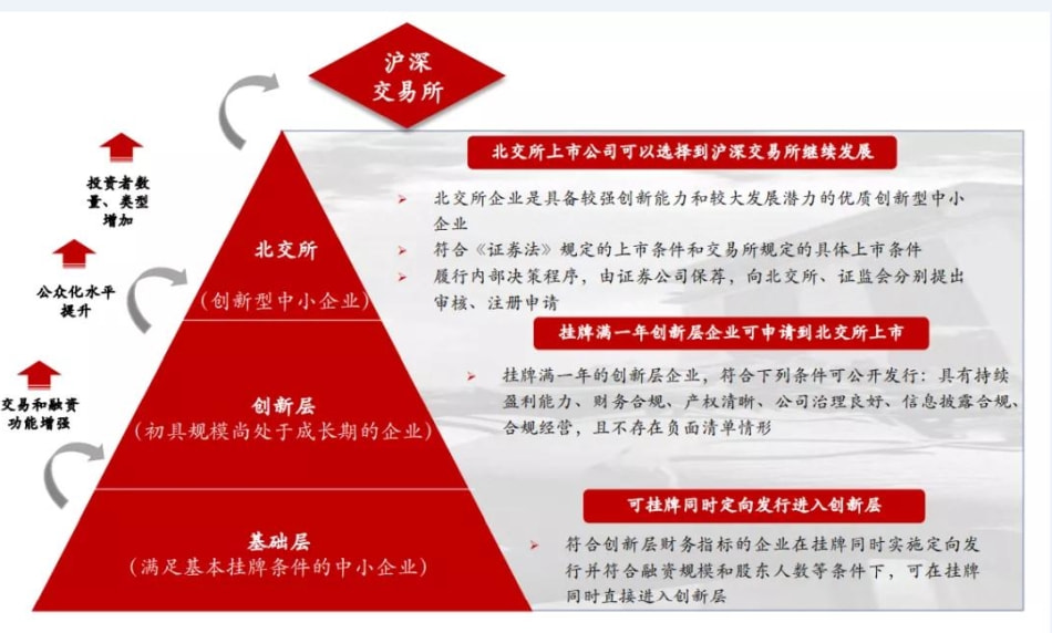 至此,我国证券交易市场结构基本搭建完成,从中小企业到大企业,北交所与上海主板和科创板,深圳主板和创业板,互为补充,形成了一个阶梯。