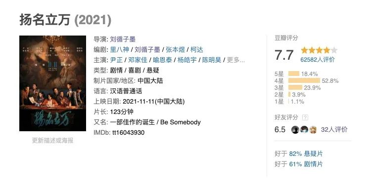 “没想到这部电影还挺好看”“毫无期待却惊喜连连”,这是不少人对电影《扬名立万》的评价。该电影在豆瓣上评分达到7.7分,成功进入豆瓣一周口碑电影榜,也成为今年华语电影市场上口碑最好的悬疑喜剧片之一。