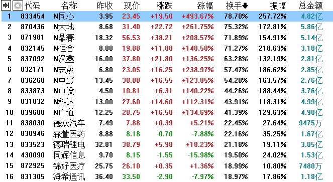 北交所81家首批上市公司开市首日换手率前16名 来源:同花顺