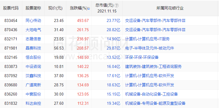 具体来看,作为全天最耀眼明星股的同心传动,以493.67%的涨幅位居榜首,盘中最高涨幅一度超过500%;大地电气上涨261.75%,位居次席;志晟信息、晶赛科技分别收涨238.97%、208.57%,位列第三、第四;涨幅最低的科达自控也达到112.31%。