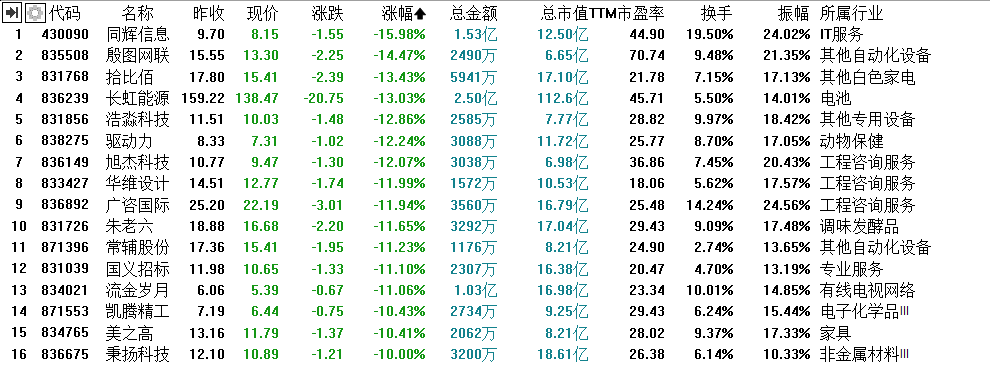 另外,71家精选层企业中有29家跌幅超过8%,其中有16家跌幅超过10%。具体来看,同辉信息跌幅近16%、殷图网联跌幅超过14.47%,拾比佰和长虹能源跌幅也分别达到13.43%、13.03%。