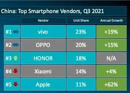 10月底,Canalys、Counterpoint Research等诸多调研机构皆已出炉2021年第三季度中国智能手机市场统计数据,报告显示,今年第三季度国内手机整体出货量达7880万部,其中vivo凭借1830万台的出货量占据23%市场份额,位居首位,OPPO、荣耀则分别以21%、18%的市场份额排名第二、第三,而仅有1090万台出货量的小米滑落为第四名。