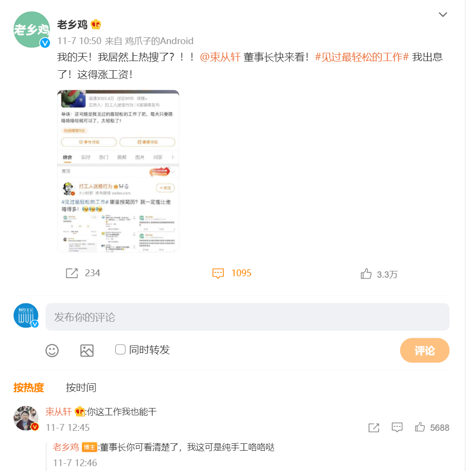 微博平台的老乡鸡早已“放飞自我”,每天朝九晚五,一天两条微博:一条咯咯哒,一条下班啦!老乡鸡的营销工作人员实现了众多打工人“躺着把钱挣了”的梦想。#见过最轻松的工作#的话题也挂上热搜。老乡鸡官方运营小编反手又是一个营销,他@了创始人束从轩,并要求涨薪,“董事长快来看,我出息了,这得涨工资!”