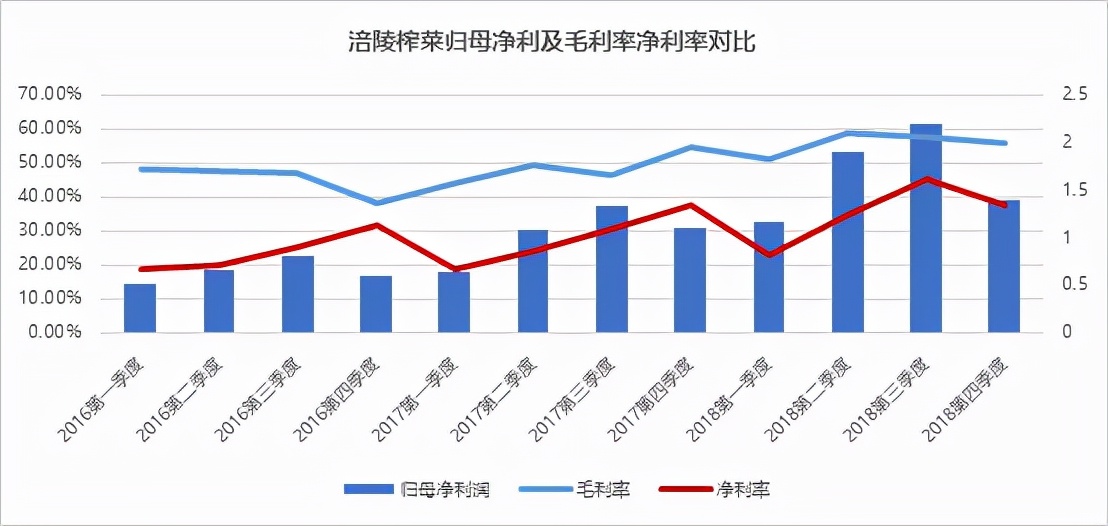涪陵榨菜的提价对毛利率和净利率贡献是巨大的。主要也体现在四季度上,毛利率同比增长16.43%,首次突破50%,达54.34%,创出阶段历史新高。