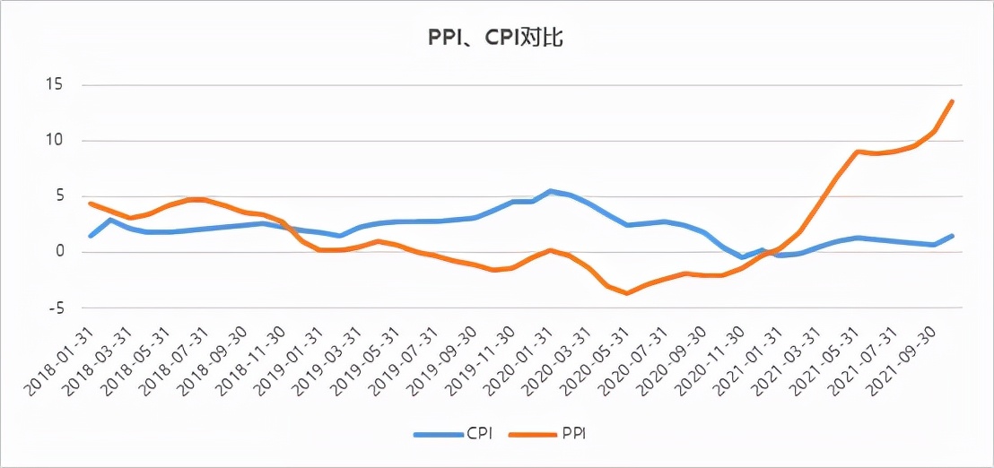 据国家统计局数据显示,10月PPI再次创下历史新高,达13.5%;CPI同比上涨1.5%,较上月回升0.8%,与PPI剪刀差处于历史最高位。