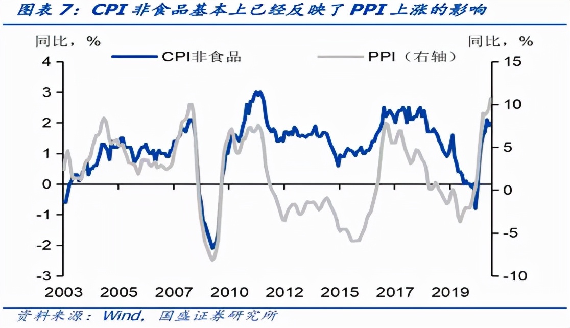 实际上,PPI向CPI的传导早已就开始。据国盛证券表示,以非食品CPI走势已反映了工业品价格上升影响,与PPI走势高度同步。