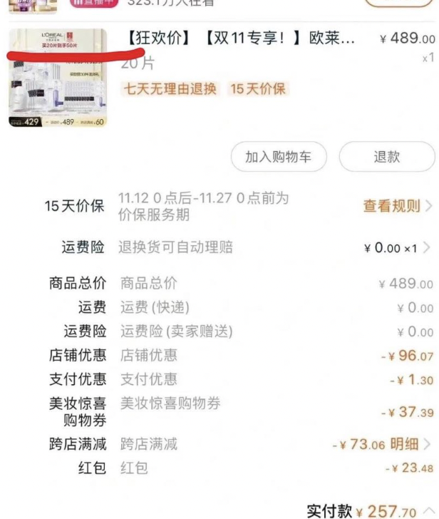 根据网上流传的消费者投诉截图显示,在欧莱雅品牌直播间以257.7元购得“李佳琦直播间429元同款面膜”的优惠过程如下: