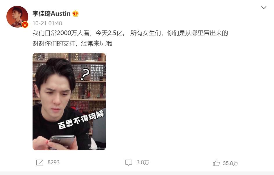 李佳琦似乎对此也感到颇为吃惊,他在10月21日凌晨发布了一条微博: