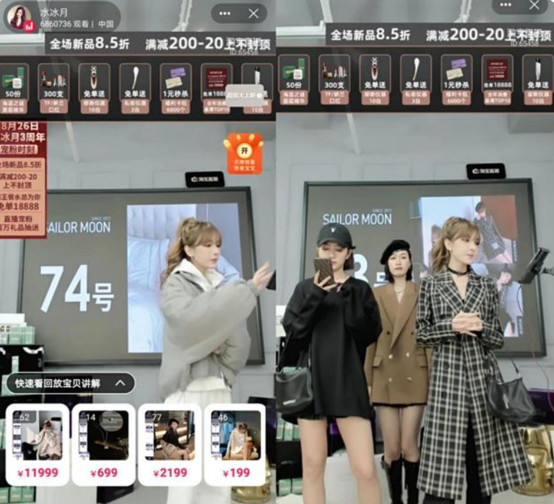 像8月底淘宝直播新推出的营销IP“星主播”的首个案例——水冰月三周年“带货节”,官方通过“超级互动城”、淘宝直播弹窗、穹顶等多种方式为其曝光。