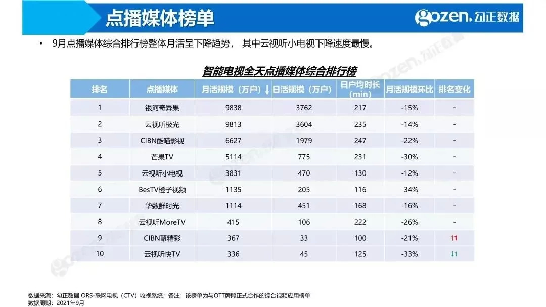 根据勾正数据发布的《2021年9月智能电视大数据报告》显示,在智能电视全体点播媒体综合排行榜中,排在前位的均是以长视频为内容载体的平台。