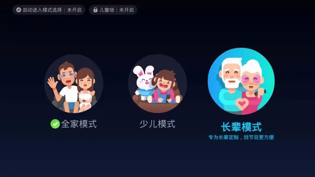 对于智能电视的受众,通常分为两极化倾向,一方面,儿童是最主要的受众群体,另一方面,中老年人也是不可忽视的受众。为此,这些长视频平台纷纷发力于儿童模式和长辈模式的开发,推出对应的产品。