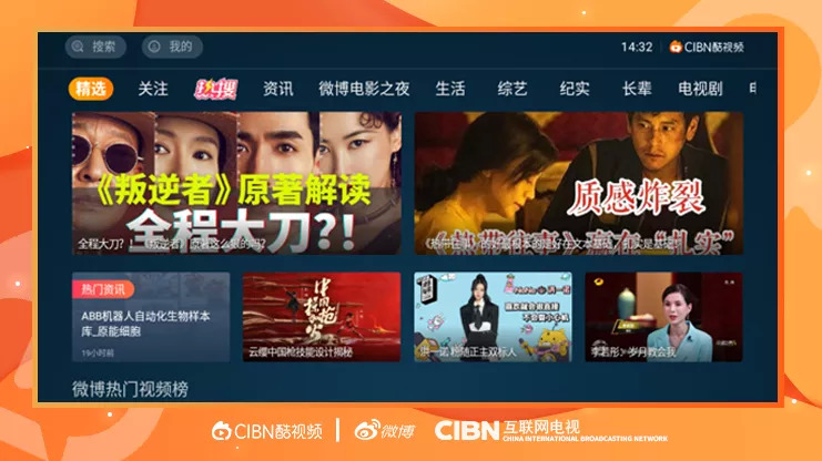 最后,作为社交平台的代表,新浪微博近几年也相中了大屏端,新浪微博联合国广东方共同推出了大屏端应用CIBN酷视频,这一平台中大部分节目来源于微博和酷燃视频,主打的仍旧是短视频内容。