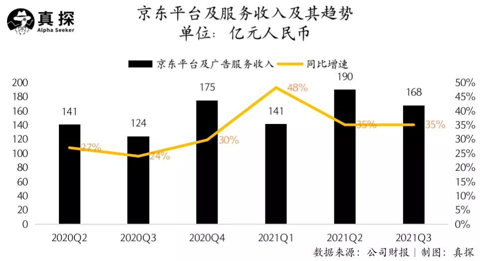 - 根据财报,京东三季度的“平台及服务收入”(主要来自3P业务的广告和佣金收入)达168亿元,同比增长35%,高于京东总营收的增长,也显著高于阿里巴巴“客户管理”收入3%的增长;