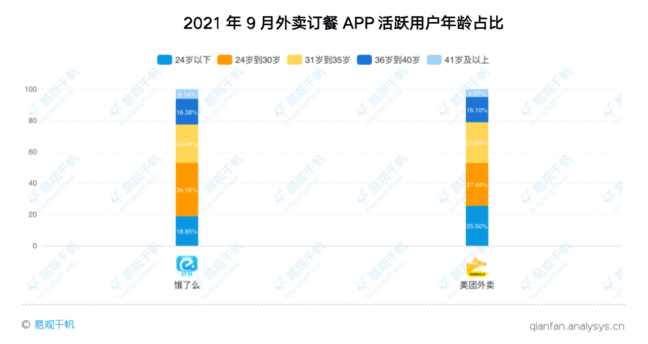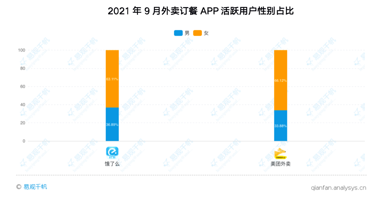据易观千帆用户属性数据显示,9月外卖订餐APP活跃用户中女性占比超6成,美团外卖和饿了么的女性用户分别占66.12%、63.11%。