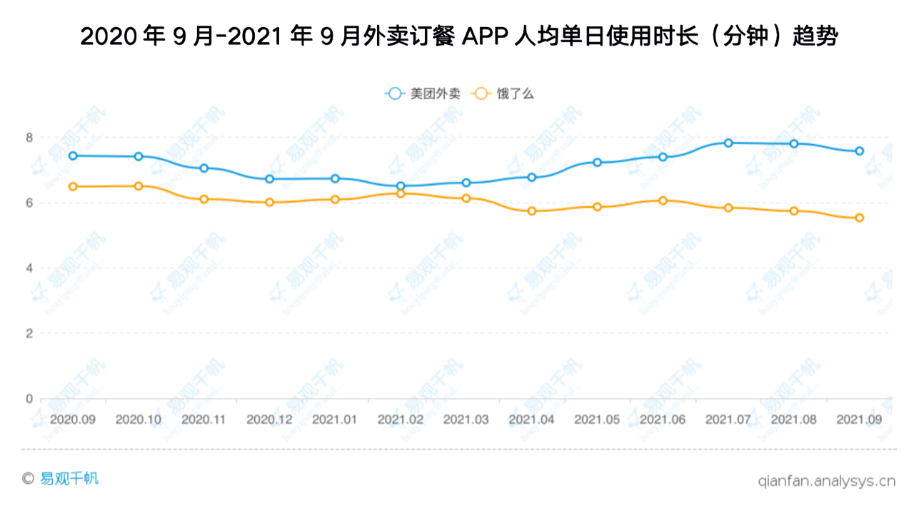在用户粘性方面,易观千帆数据显示,9月美团外卖APP的人均单日使用时长为7.58分钟,相较饿了么APP高出2分多钟,美团外卖APP自今年2月以后呈上升趋势,而饿了么APP则呈下降趋势,两者差距逐步拉大。