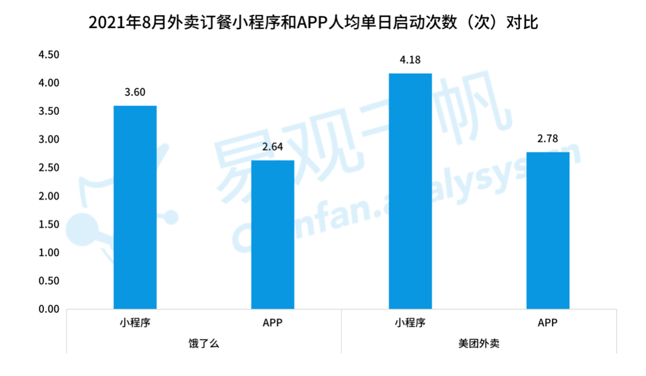 对比两家小程序和APP的用户启动次数情况发现,小程序的人均单日启动次数高于APP,8月饿了么和美团外卖小程序人均单日启动次数分别为3.60次和4.18次,两者差距较APP略微扩大。