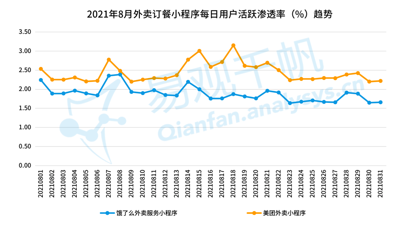对比2021年8月APP和小程序日活跃数据可以发现,在APP用户规模上,饿了么的日活跃用户远远领先于美团外卖,日均活跃规模是美团外卖的近1.8倍,不过在小程序的日活跃渗透率上,美团外卖高于饿了么,日均活跃渗透率为2.44%,同期的饿了么小程序日均活跃渗透率为1.89%。从数据表现上可以推断,美团外卖用户在小程序使用倾向上比饿了么用户更为明显,小程序的使用对于APP用户活跃量会产生一定的分流。