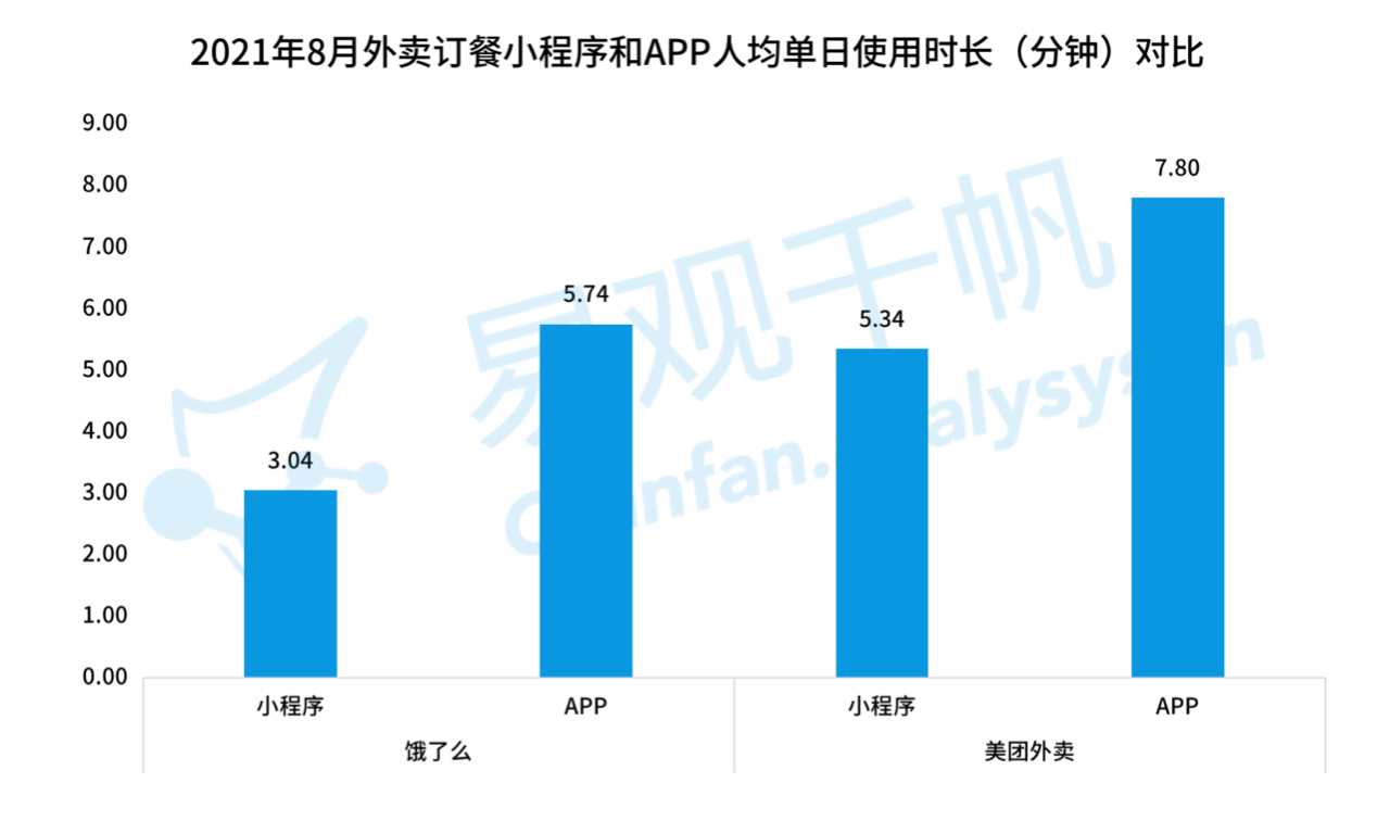 对比两家小程序和APP的用户使用时长情况发现,小程序的人均单日使用时长不及APP,8月饿了么和美团外卖小程序人均单日使用时长分别为3.04分钟和5.34分钟,仍是美团外卖领先。