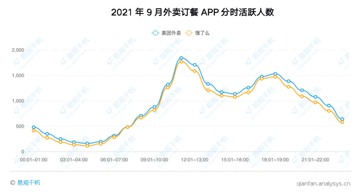 从易观千帆分时数据来看,不管是美团外卖还是饿了么,其用户的外卖订餐行为呈现高度一致性,上午开始活跃人数逐步攀升,到中午11点-12点为一天中活跃人数最高峰,此后逐步回落至高峰时段的2/3左右,到晚上18点-19点达到次高峰,不过在深夜23-24点的活跃人数仍有高峰时段的1/3左右,可见外卖订餐服务也满足了一大批夜猫子人群的夜宵需求。