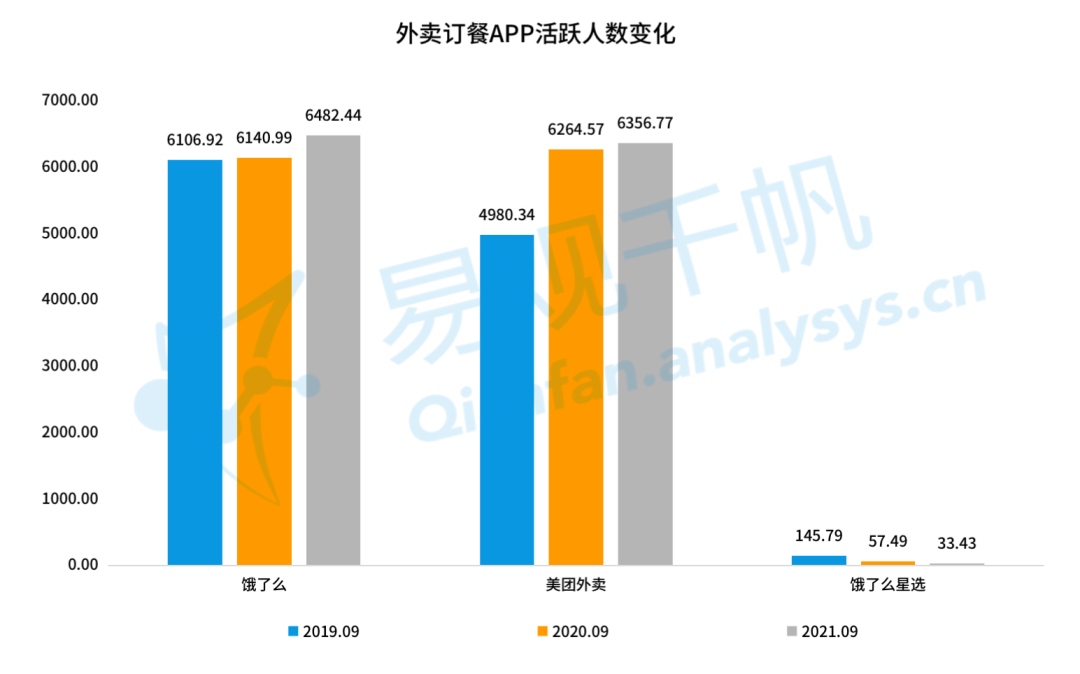 目前外卖订餐APP中,排除商家版之外,基本就是饿了么和美团外卖的天下。从最近三年的9月同期数据对比来看,美团外卖APP的用户规模在疫情之后迅速增长,在去年9月活跃人数赶超饿了么, 不过最近一年饿了么的增幅高于美团外卖,2021年9月饿了么APP实现6482.44万的活跃人数,略高于美团外卖。饿了么星选的活跃用户逐年递减,9月活跃人数仅33.43万人。