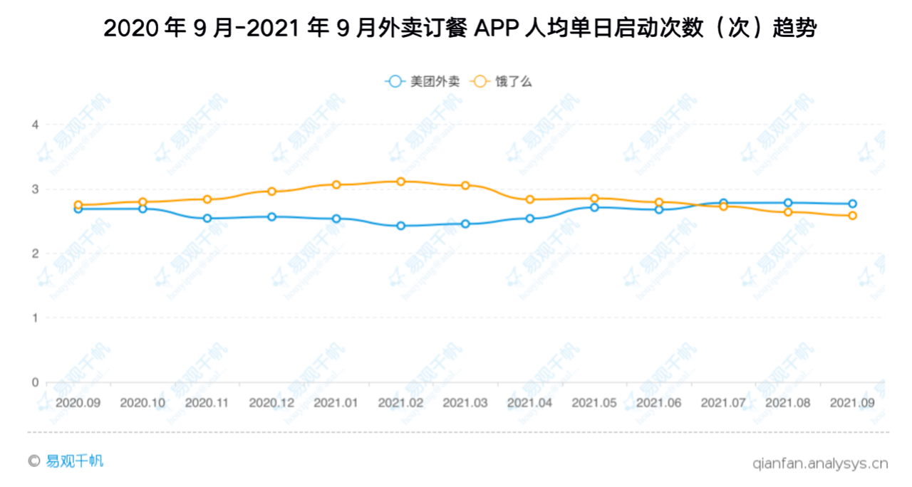 我们再来看下体现用户粘性的另一个指标——人均单日启动次数,9月饿了么APP和美团外卖APP人均单日启动次数分别为2.58次和2.77次,数据非常接近。美团外卖APP自今年7月开始人均单日启动次数反超饿了么APP。
