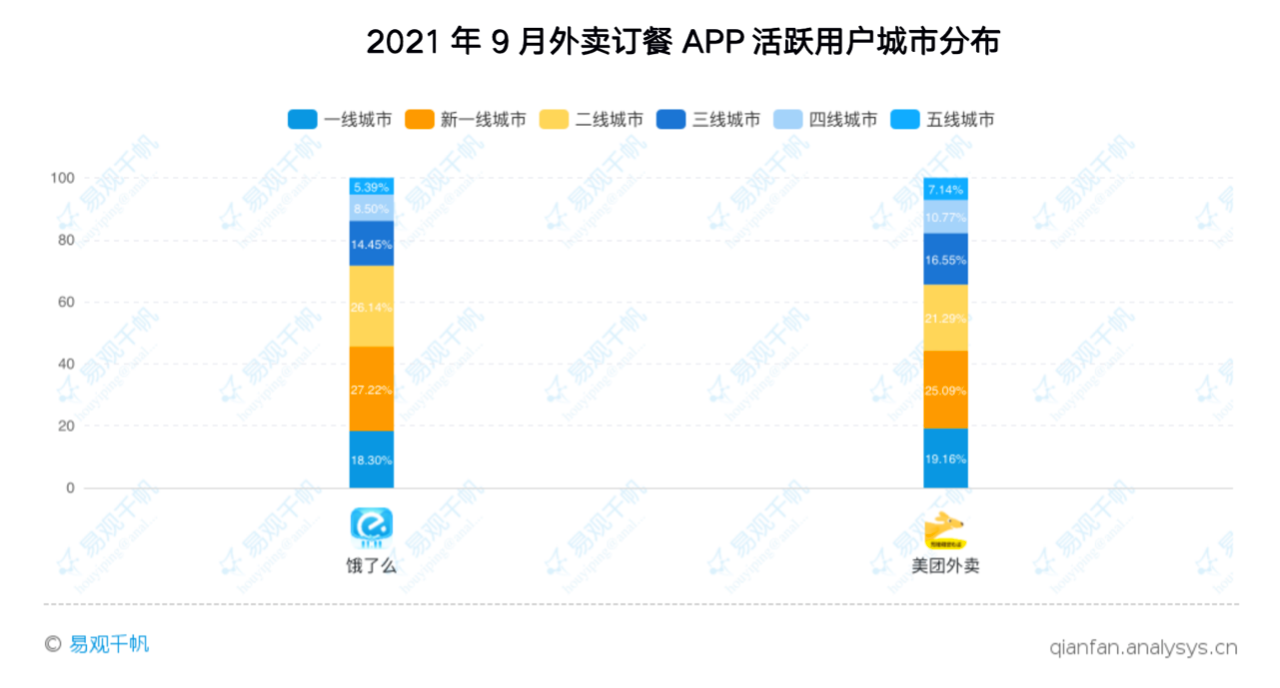 目前外卖订餐服务还是以一二线城市为主力,千帆数据显示,9月外卖订餐APP活跃用户在一线、新一线、二线城市占比合计超六成,饿了么高达71.66%,其中新一线城市占比达27.22%;美团外卖的一线城市用户占比略高于饿了么,为19.16%,在三四五线下沉市场的渗透也较饿了么略高。随着线上化进程的推进,未来外卖市场将继续向下沉市场渗透,除了头部企业可以开拓更多新市场外,对于地方本土型企业及地方餐饮行业或也是机会。