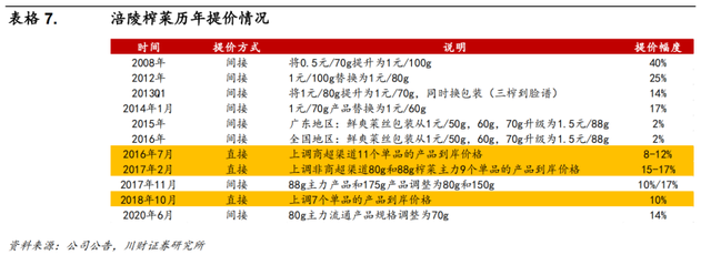 2008年之前,涪陵榨菜旗下70g装的乌江榨菜终端零售价仅为0.5元。算上这次提价,涪陵榨菜在过去的十余年里,直接或简介提价共12次,终端零售价也从0.5元直接“奔四”。