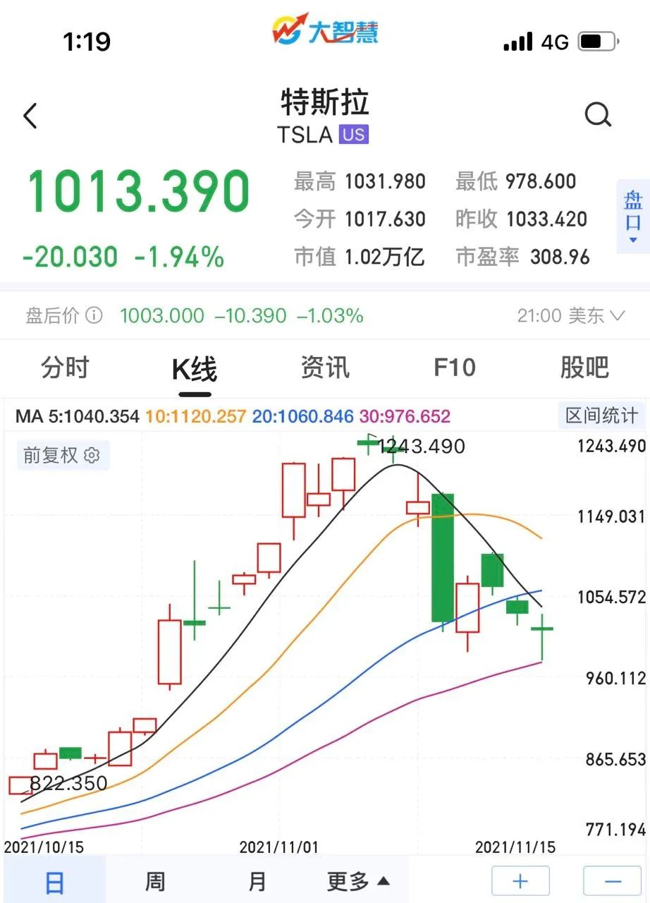 特斯拉的增长一直持续到11月4日,股价最高达1243.49美元,市值逼近1.25万亿美元。