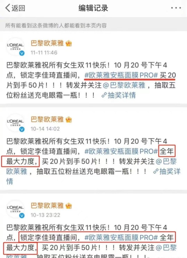 同往年一样,今年双十一开始得格外早,各种品牌都提前开始预热,让巴黎欧莱雅陷入这轮口水仗的安瓶面膜也位列其中。当时欧莱雅为两位主播提供了同样的折扣价,以买20片送30片的搭配让消费者用429元得以一次性购入50片面膜。10月中旬的宣传阶段,巴黎欧莱雅也曾官方表示预售当晚直播间价格为“全年最大力度”,此条微博现已删除。