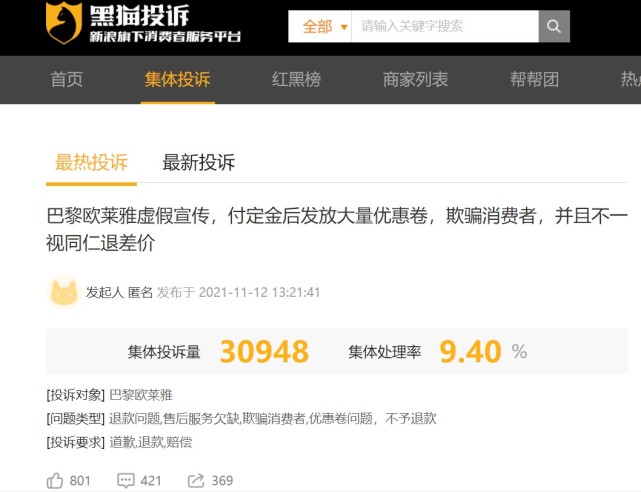 于是领略了套路,感受到欺瞒的消费者们开始狙击利益相关方。据黑猫投诉平台数据,截至发稿,关于“巴黎欧莱雅虚假宣传,预售价格更高”的集体投诉累计超过三万条。