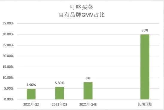 财报显示,叮咚买菜三季度的主要自有品牌在相关品类的GMV占比已达到27.0%,同比提升22.6个百分点。平安证券报告指出, 长期来看,叮咚买菜自有品牌的占整体GMV的比例将从今年三季度的5.8%提升到30%左右。