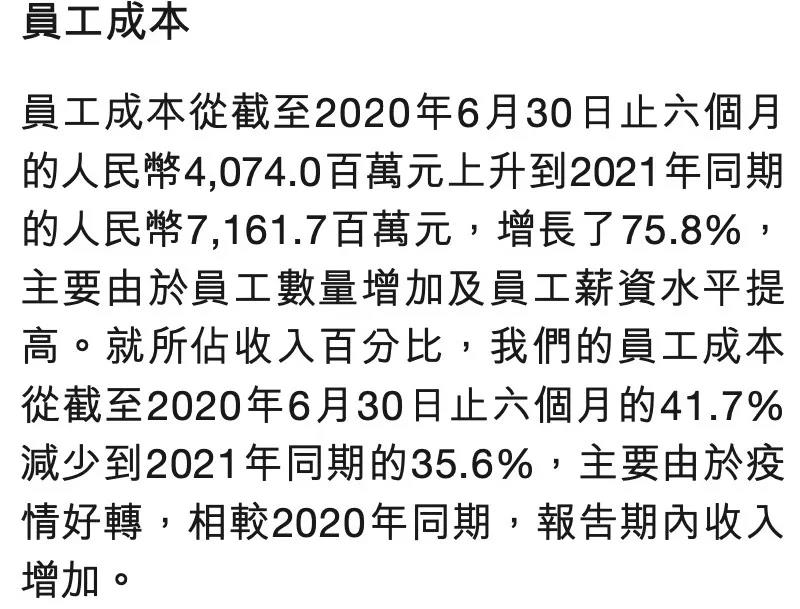 2021年上半年,海底捞员工数激增至140505人,员工成本为71.62亿元,同比增长了75.8%,该项成本占收入35.6%。
