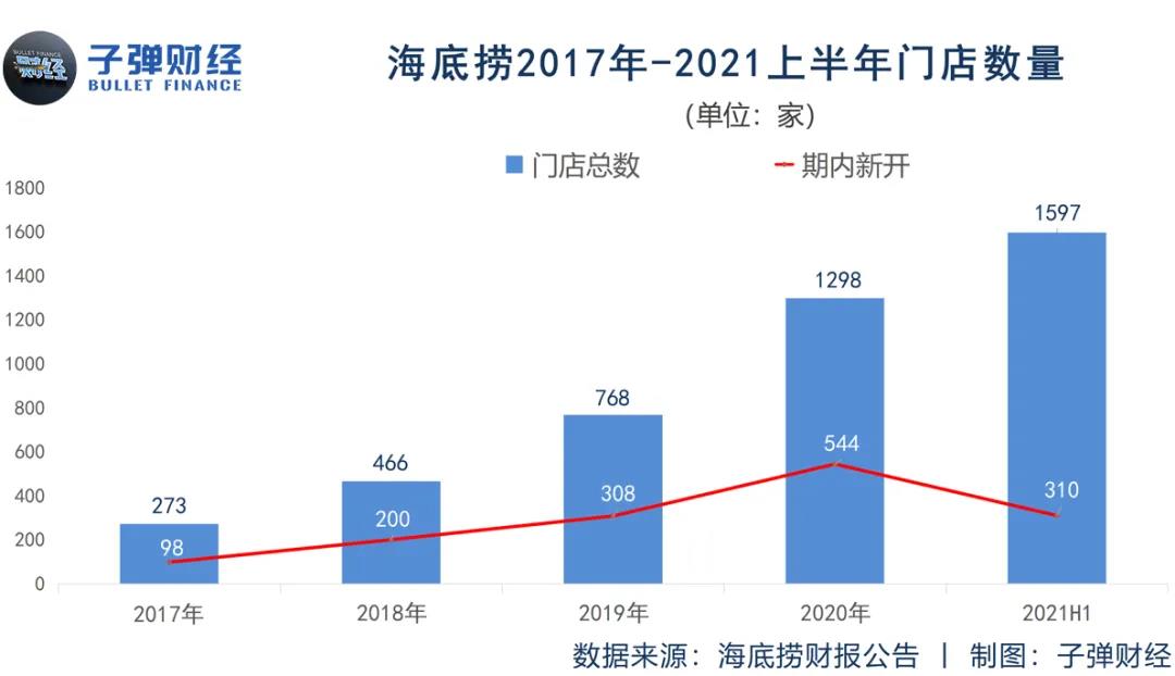 而从2018年起,海底捞每年以50%以上的速度开店。仅2020年一年就开出了544家门店,比奈雪的茶门店总量还多(截至今年2月5日,其门店总数为507家),相当于7个巴奴毛肚火锅(78家)。4年半时间,海底捞的门店总数实现了6倍增长。