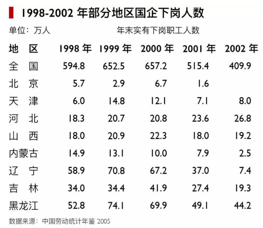 而在此时,东北的工业剧烈转型,大烟囱轰然倒地时,东北下岗员工的数量占到了全国下岗人数的 22%,每 5 个下岗工人里面就有一个人是在东北失业的。