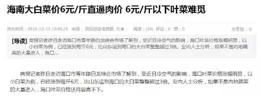 作为海岛,海南耕地面积有限,90年代那会岛上的主要农作物,主要都是椰子芒果之类的水果,蔬菜种类少得可怜,在北方1毛/斤的白菜,在海南却能卖出天价,即便是物流发达的今天,白菜价都曾高达6元斤。