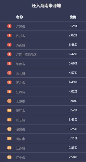 但从百度大数据的统计中可以看到,迁入海南的东北人在占比上都排不上号,虽然这类统计难以覆盖大量冬季聚集海南的北方候鸟人群。