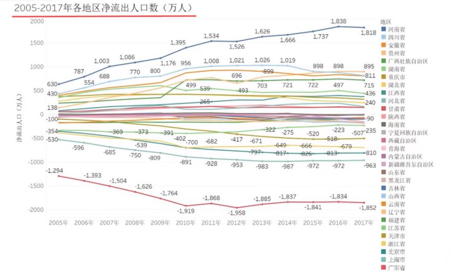 从这张“2005年—2017年全国各地区净流出人口数”的统计中我们可以发现: